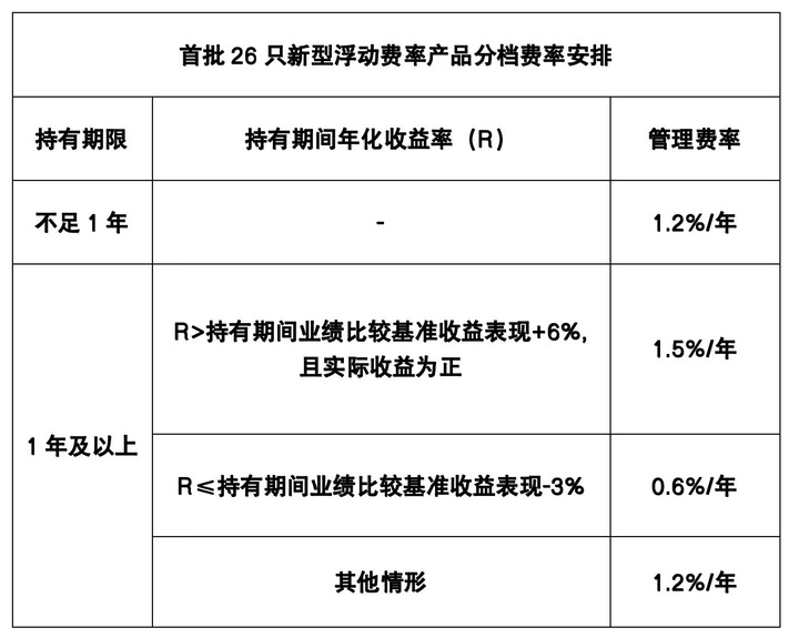 首批新型浮動費率基金產(chǎn)品均設(shè)置了1.2%(基準檔)、1.5%(升檔)、0.6%(降檔)三檔費率水平。投資者持有一年以后贖回產(chǎn)品時,基金管理人將會根據(jù)產(chǎn)品年化收益水平與業(yè)績比較基準的對比情況,來計提不同檔次的管理費。(記者劉慧)