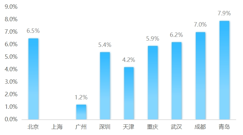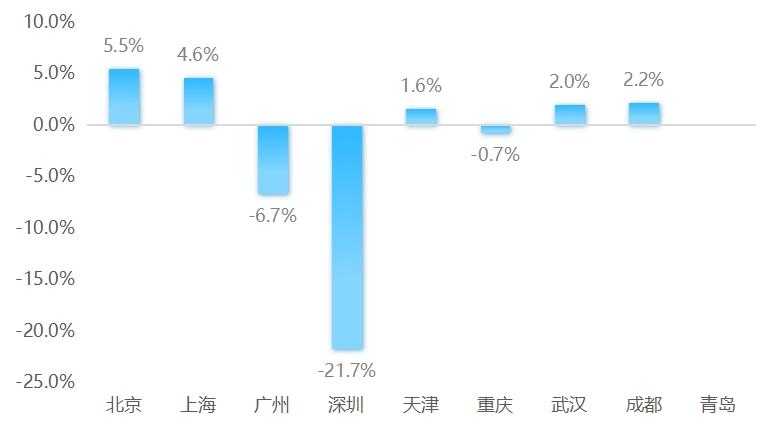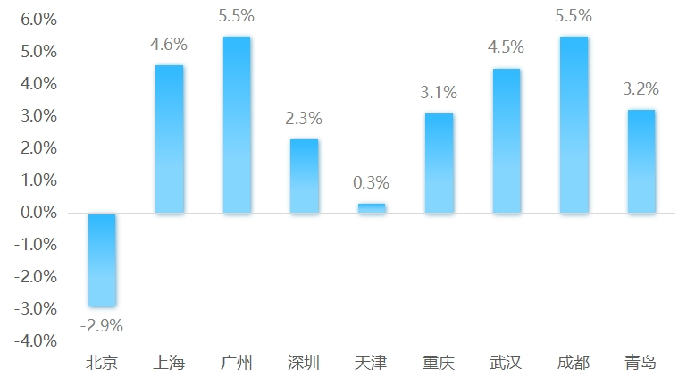 增速方面,中西部城市表現(xiàn)更為搶眼。成都以5.8%的增速領(lǐng)跑重點(diǎn)城市,武漢、重慶兩個(gè)中西部城市也分別有5.6%和5.3%的同比增速,全國(guó)經(jīng)濟(jì)增長(zhǎng)動(dòng)力正在向更廣地域進(jìn)一步擴(kuò)散。深圳(5.5%)、北京、上海(均為5.4%)等均跑贏全國(guó)平均水平,超一線核心城市在復(fù)雜多變的國(guó)際環(huán)境與國(guó)內(nèi)轉(zhuǎn)型壓力下,表現(xiàn)出強(qiáng)勁的韌性。