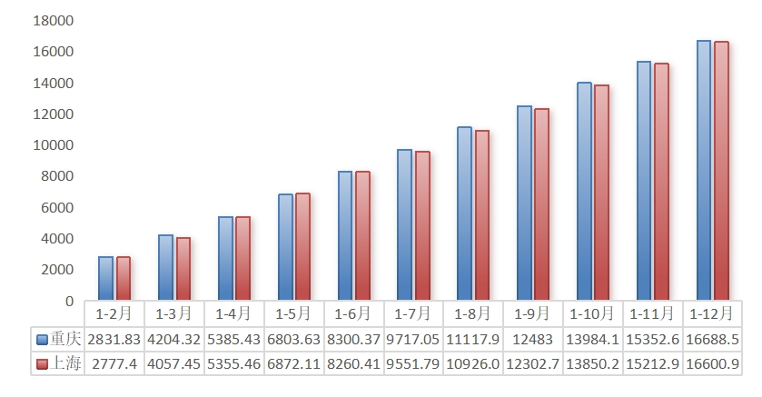//圖2 2025年重慶和上海社會(huì)消費(fèi)品零售總額對(duì)比(億元)