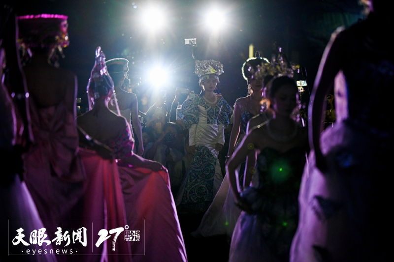 去年7月,楊春林和母親回到凱里。在黔東南州建州68周年的當(dāng)天,他邀請父老鄉(xiāng)親以農(nóng)具為道具、以傳統(tǒng)服飾為媒介,集體演繹一場非遺時裝大秀為故鄉(xiāng)“慶生”,成為了如今貴州“村T”的初舞臺。