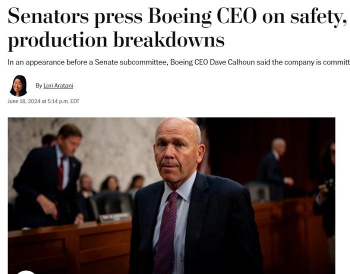據(jù)美國《華盛頓郵報(bào)》報(bào)道,就在卡爾霍恩接受質(zhì)詢的前不久,參議院委員會(huì)發(fā)布了一份報(bào)告,稱波音公司“丟失了數(shù)百份關(guān)于不合格的飛機(jī)零部件的記錄,裁掉了質(zhì)量檢查員,并讓制造工人負(fù)責(zé)簽署自己的工作”。議員們還表示,這些發(fā)現(xiàn)與波音公司將安全放在首位的保證存在矛盾。