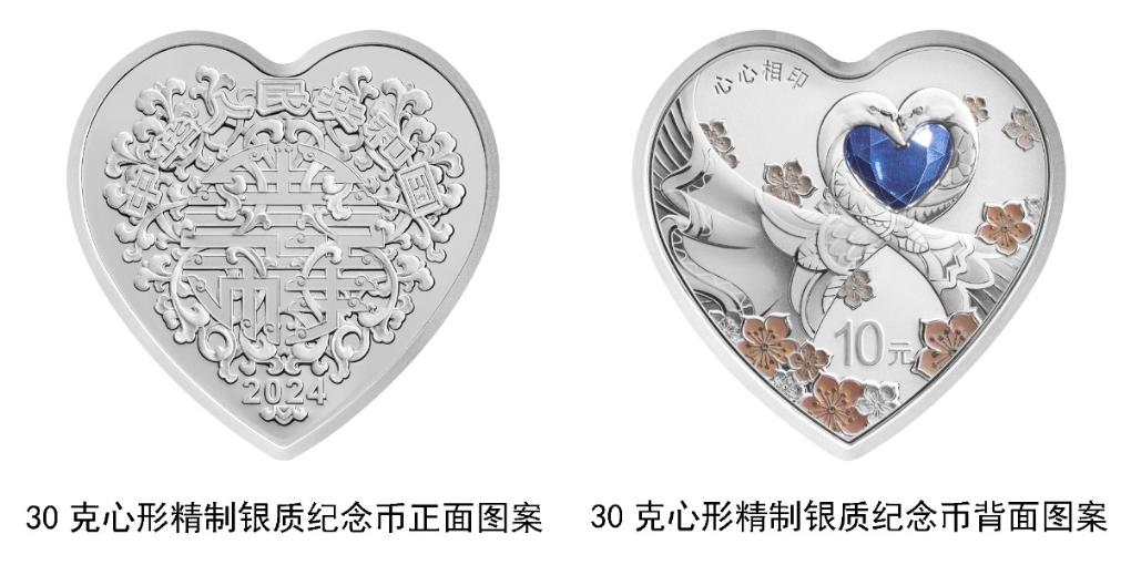 中國人民銀行5月13日對外宣布,將于2024年5月20日發(fā)行2024吉祥文化金銀紀(jì)念幣一套。其中,兩枚心形紀(jì)念幣引人關(guān)注。